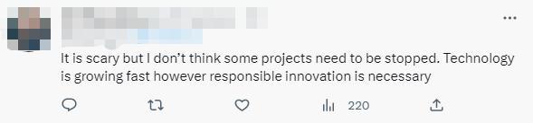 還有人分析,“這很可怕,但我認(rèn)為有些項(xiàng)目不需要停止。技術(shù)正在發(fā)展迅速,負(fù)責(zé)任的創(chuàng)新也是必要的?!?/p>