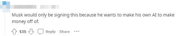 但也有人懷疑馬斯克的動(dòng)機(jī),“馬斯克之所以會(huì)簽署它,因是為他想用自己的人工智能來(lái)賺錢?!?/p>