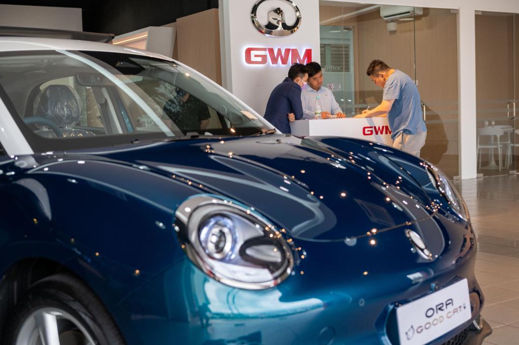 2月17日,在馬來西亞吉隆坡,一名顧客準(zhǔn)備試駕中國(guó)長(zhǎng)城汽車旗下的歐拉好貓新能源汽車。