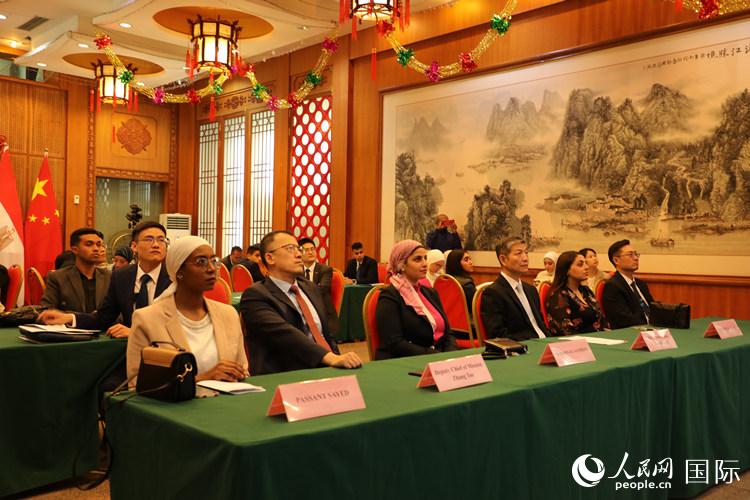 全體與會者共同觀看了阿文版《中國共產(chǎn)黨國際形象網(wǎng)宣片》。使館2名青年外交官代表結(jié)合自身工作經(jīng)歷,分別以《從三個關(guān)鍵詞讀懂中共二十大重要意義》和《從十年之變看中國式現(xiàn)代化》為題,深入淺出闡釋中共二十大的時代意義和深遠影響,以及中國式現(xiàn)代化對發(fā)展中國家的重要啟示。開羅大學(xué)3名師生代表結(jié)合自身工作和學(xué)習(xí)經(jīng)歷,積極分享對中國式現(xiàn)代化的認識和體會,高度評價中國發(fā)展成就,贊賞中國通過“一帶一路”合作助力埃及發(fā)展,表示愿為推動埃中關(guān)系進一步發(fā)展貢獻青春力量。