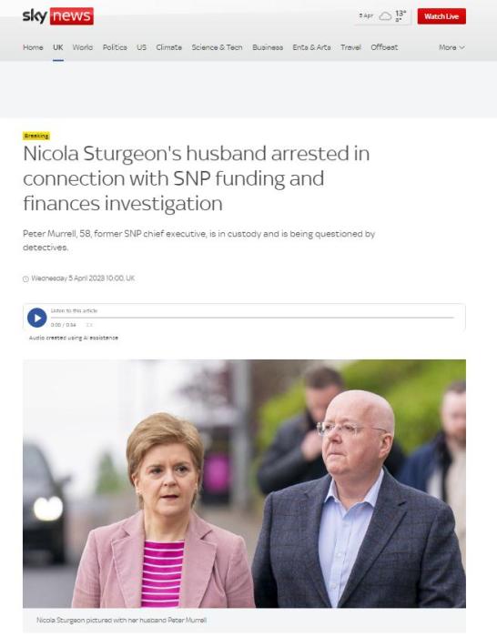中新網(wǎng)4月5日電 據(jù)英國廣播公司(BBC)報(bào)道,英國蘇格蘭政府前首席大臣妮古拉·斯特金的丈夫因與蘇格蘭民族黨財(cái)政調(diào)查有關(guān)而被捕。
