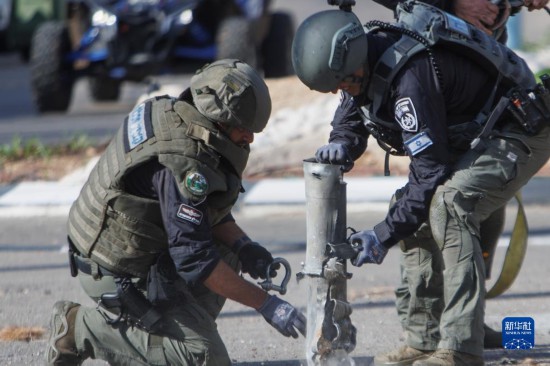 4月6日,在以色列北部的什洛米鎮(zhèn),安全人員處理一枚火箭彈。新華社/基尼圖片社