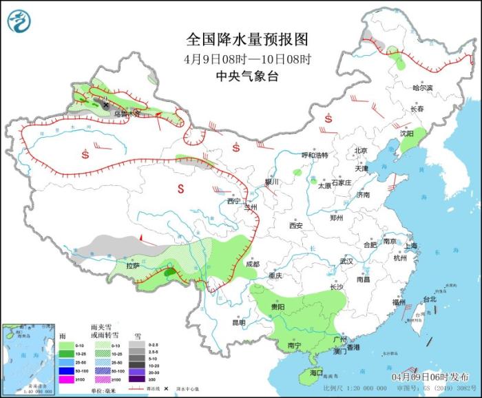 4月9日08時至10日08時,新疆沿天山地區(qū)、西藏南部和東部、甘肅河西、川西高原北部、內蒙古東北部等地部分地區(qū)有小到中雪或雨夾雪,其中,新疆天山山區(qū)的高海拔地區(qū)有中到大雪(5~9毫米)。西藏東南部、四川盆地西部、貴州中南部、湖南南部、廣西大部、廣東西部、海南島大部、遼寧東部等地部分地區(qū)有小雨,其中,新疆伊犁河谷、西藏東南部等地部分地區(qū)有中雨。內蒙古中西部、新疆南疆盆地、西北地區(qū)北部、遼寧西部、山東半島等地部分地區(qū)有4~6級風,其中,內蒙古西北部部分地區(qū)有6~7級風,新疆東部、西藏中部等地部分地區(qū)有7~8級風。臺灣海峽、南海北部和中部、巴士海峽將有6~7級、陣風8級的東北風。