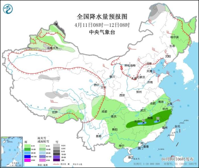 4月11日08時至12日08時,新疆北疆北部和沿天山地區(qū)、內蒙古東北部、黑龍江西北部、西藏東部和南部、青海西部、川西高原北部等地部分地區(qū)有小到中雪或雨夾雪,其中,新疆阿勒泰北部等地部分地區(qū)有中到大雪(5~9毫米)。東北地區(qū)東部、西藏東南部、西南地區(qū)東部、江淮大部、江南、華南西部和北部等地部分地區(qū)有小到中雨,其中,湖南中部、江西中部、福建西北部等地部分地區(qū)有大雨(25~40毫米)。內蒙古中東部、東北地區(qū)大部、華北東北部、山東半島等地部分地區(qū)有4~6級風,其中,內蒙古東部、西藏中部等地部分地區(qū)有6~7級風。