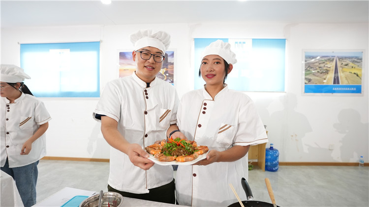 4月6日,柬埔寨新金邊國際機(jī)場項(xiàng)目建設(shè)現(xiàn)場,劉曉仙(左)和曼玉良在中國建筑(柬埔寨)職工廚王爭霸賽上展示“中建(柬)一家親”炒米粉。中國建筑供圖