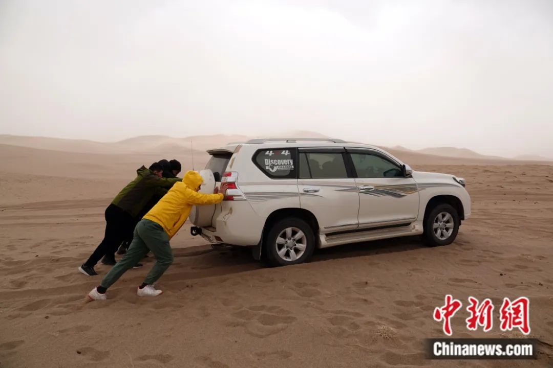 2023年4月,第三次新疆科考阿爾金山野外科考隊一行,前往阿爾金山國家級自然保護區(qū)庫木庫里沙漠的沙子泉考察調研,遭遇強沙塵暴天氣,科考隊員推車。孫自法 攝