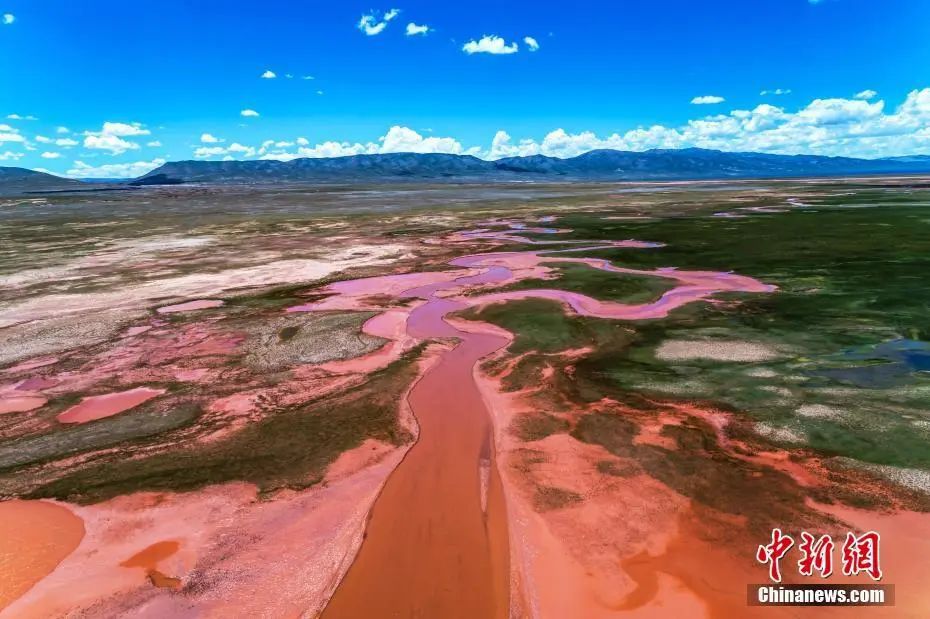 阿拉克湖多條支流奔流不息地拍打著紅色河床,猶如碧玉寶鏡舞動(dòng)著紅色絲帶。柴迪成 攝