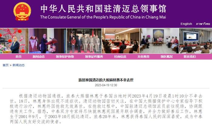 中新網(wǎng)4月19日電 據(jù)中國駐清邁總領(lǐng)事館消息,根據(jù)清邁動物園通報,旅泰大熊貓林惠于泰國當(dāng)?shù)貢r間2023年4月19日凌晨1時10分不幸去世。
