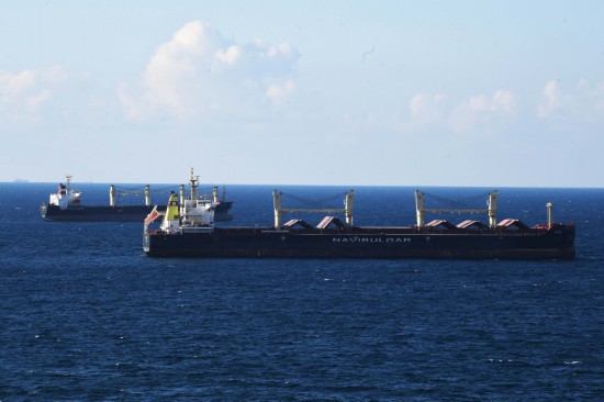 2022年8月6日,從烏克蘭出發(fā)的第二批運糧船抵達土耳其伊斯坦布爾的博斯普魯斯海峽黑海入??诟浇#ㄐ氯A社記者沙達提攝)