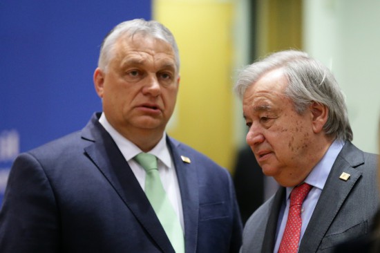 3月23日,在比利時(shí)布魯塞爾的歐盟總部,聯(lián)合國(guó)秘書長(zhǎng)古特雷斯(右)與匈牙利總理歐爾班在歐盟峰會(huì)開始前交談。(新華社記者鄭煥松攝)