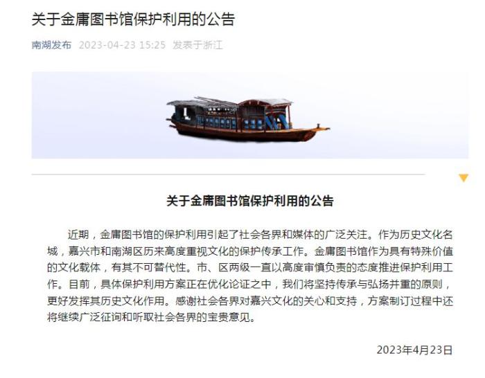 中新網(wǎng)4月23日電 近期,金庸圖書館的保護(hù)利用引發(fā)關(guān)注。浙江省嘉興市南湖區(qū)人民政府今日通過微信公眾號(hào)發(fā)布公告稱,作為歷史文化名城,嘉興市和南湖區(qū)歷來(lái)高度重視文化的保護(hù)傳承工作。金庸圖書館作為具有特殊價(jià)值的文化載體,有其不可替代性。市、區(qū)兩級(jí)一直以高度審慎負(fù)責(zé)的態(tài)度推進(jìn)保護(hù)利用工作。目前,具體保護(hù)利用方案正在優(yōu)化論證之中,南湖區(qū)將堅(jiān)持傳承與弘揚(yáng)并重的原則,更好發(fā)揮其歷史文化作用。感謝社會(huì)各界對(duì)嘉興文化的關(guān)心和支持,方案制訂過程中還將繼續(xù)廣泛征詢和聽取社會(huì)各界的寶貴意見。