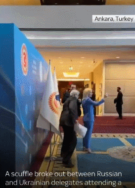 中新網(wǎng)5月5月電 綜合外媒報(bào)道,當(dāng)?shù)貢r(shí)間4日,在土耳其安卡拉舉行的黑海經(jīng)濟(jì)合作組織議會(huì)大會(huì)(PABSEC)會(huì)議間隙,俄烏代表團(tuán)成員因?yàn)橐幻鏋蹩颂m國旗扭打在了一起。
