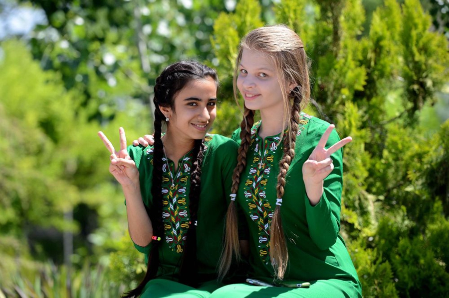 ↑身著民族服飾的哈薩克斯坦女孩在阿斯塔納展示傳統(tǒng)美食,迎接納烏魯斯節(jié)。