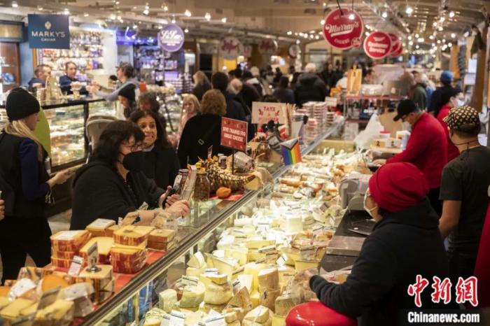 2022年冬季,顧客在紐約中央車站市場詢問奶酪價(jià)格。美國在當(dāng)年遭遇了40年來最嚴(yán)重的通貨膨脹。消費(fèi)者價(jià)格指數(shù)(CPI)同比漲幅在6月達(dá)到9.1%的峰值后,一直保持在7%以上的高位,持續(xù)“高燒”的通脹令經(jīng)濟(jì)承壓。廖攀 攝