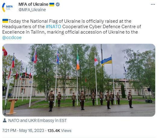 烏克蘭外交部在推特上發(fā)布圖片并配文稱,“今天,烏克蘭國旗在位于塔林的北約合作網(wǎng)絡(luò)防御卓越中心總部正式升起,標(biāo)志著烏克蘭正式加入該組織?!?/p>