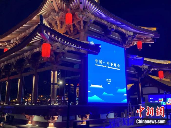 2023年5月11日,西安,曲江池遺址公園夜色闌珊。中國-中亞峰會宣傳牌點亮,峰會即將在西安召開。李溪龍 攝