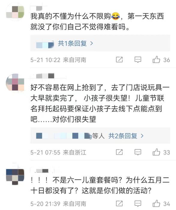 但自5月20日起,在社交平臺上,就不斷有人反映,已經(jīng)買不到肯德基兒童節(jié)限定玩具??系禄墓俜轿⒉┫?,也有很多人留言,門店已售罄,能不能補貨。