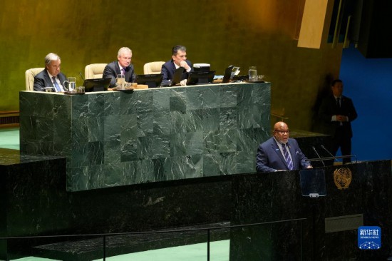 6月1日,在位于紐約的聯(lián)合國總部,特立尼達和多巴哥常駐聯(lián)合國代表丹尼斯·弗朗西斯(前)當(dāng)選第78屆聯(lián)合國大會主席后發(fā)表講話。新華社發(fā)(聯(lián)合國供圖/洛伊·費利普攝)