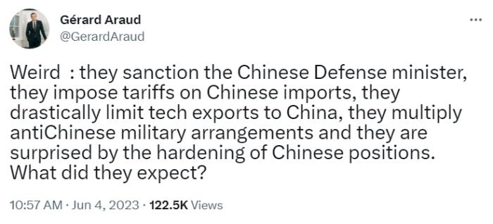 中新網(wǎng)6月5日電 日前,法國前駐美大使熱拉爾·阿羅在推特上提出一個值得思考的問題,“奇怪,他們(美國)制裁中國國防部長,他們對中國進(jìn)口商品征收關(guān)稅,他們大幅限制對華技術(shù)出口……現(xiàn)在他們反而對中國立場的強(qiáng)硬感到驚訝。美國到底想要什么?”