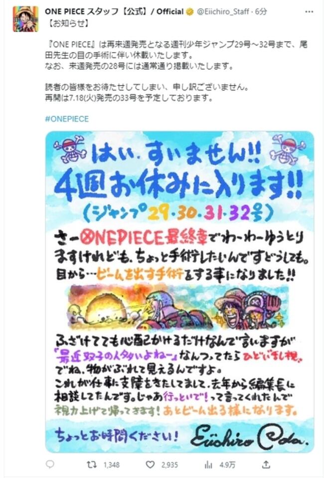 其官網(wǎng)還發(fā)布了尾田榮一郎在自己的手繪插畫(huà)上寫(xiě)的“請(qǐng)假條”。他表示:“非常抱歉,我將休息四周時(shí)間。《航海王》雖然已經(jīng)進(jìn)入終章,但由于眼睛的散光很?chē)?yán)重,看東西時(shí)出現(xiàn)重影,所以需要做個(gè)手術(shù)。請(qǐng)給我一些時(shí)間(修養(yǎng)一下)?!?/p>