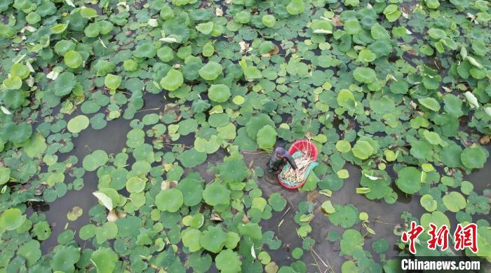 5月23日,武漢蔡甸藕農(nóng)正在荷塘里“抽”藕帶。 中新社記者 張暢 攝