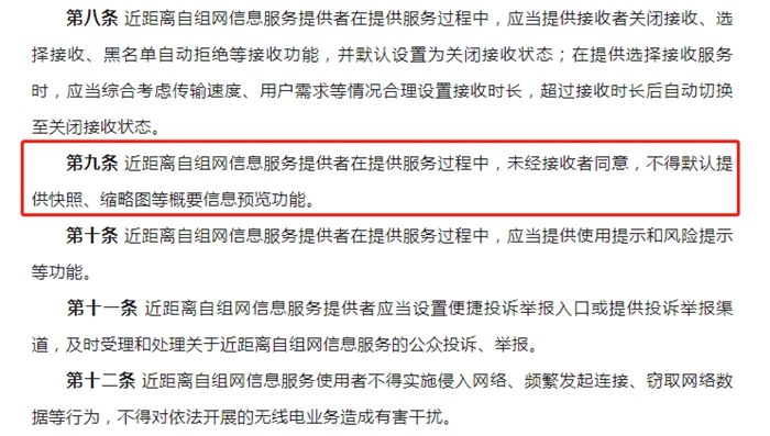 特別要注意的是,征求意見稿還提出“近距離自組網信息服務提供者在提供服務過程中,未經接收者同意,不得默認提供快照、縮略圖等概要信息預覽功能”。如前文所述,目前隔空投送存儲失敗選擇使用“文件”打開時,在未完全接收的情況下可顯示信息縮略圖。