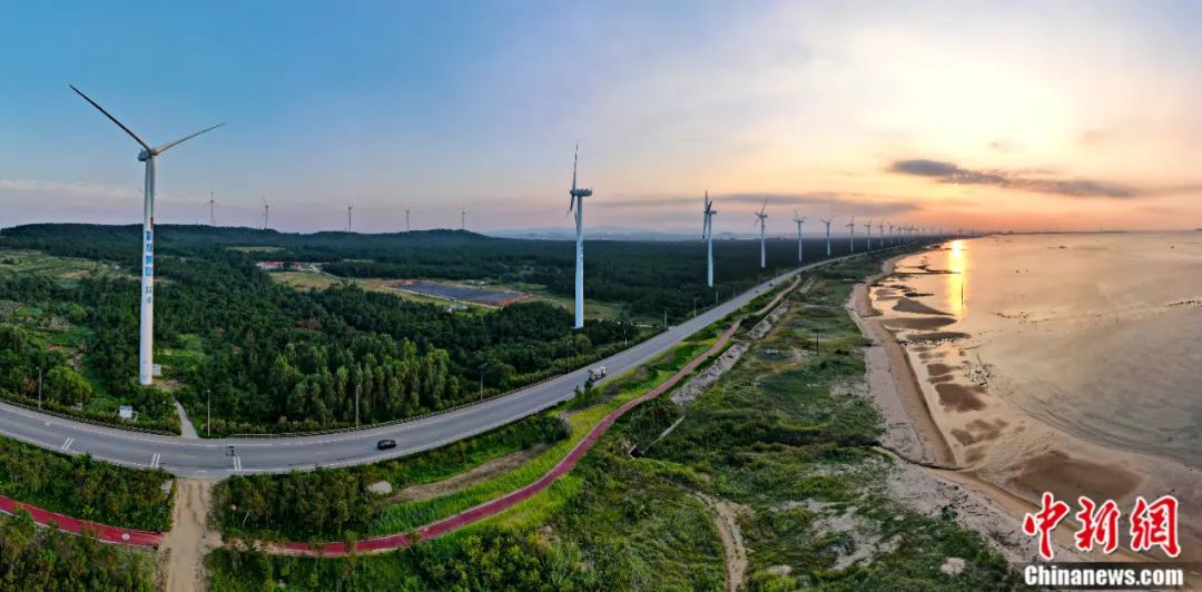 山東省榮成市北環(huán)海路,風力發(fā)電機與沿海防護林形成一道靚麗的風景線。近年來,中國大力推廣風電產(chǎn)業(yè)等“綠色能源”,實現(xiàn)生態(tài)保護和可持續(xù)發(fā)展。楊志禮 攝
