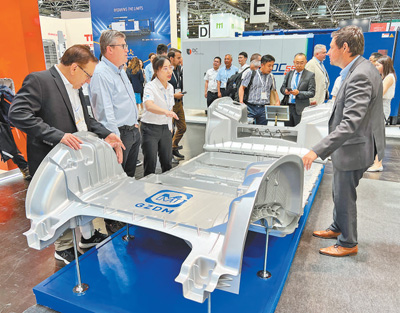 在一家中國(guó)企業(yè)展臺(tái)前,采用一體化壓鑄技術(shù)的新能源車身吸引外國(guó)客商前來(lái)咨詢。