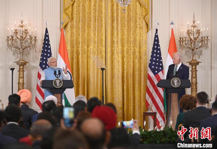 當(dāng)?shù)貢r(shí)間6月22日,印度總理莫迪對(duì)美進(jìn)行國(guó)事訪問(wèn)。圖為美國(guó)總統(tǒng)拜登與莫迪在白宮出席聯(lián)合記者會(huì)。中新社記者 陳孟統(tǒng) 攝