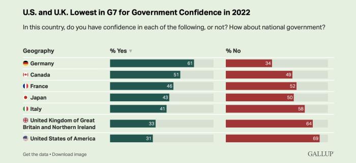 據(jù)《國會山報》當?shù)貢r間7月3日報道,根據(jù)蓋洛普最新發(fā)布的一項針對七國集團政府信心指數(shù)的民意調(diào)查顯示,美國和英國獲得的信心指數(shù)最低。