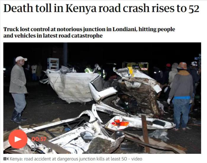 肯尼亞交通部長(zhǎng)穆?tīng)柨崎T(mén)在訪問(wèn)事故現(xiàn)場(chǎng)時(shí)表示,在發(fā)生這場(chǎng)“可怕”且“痛苦”的悲劇之后,將引入新的安全措施。他表示,“事故原因調(diào)查已經(jīng)展開(kāi),但我們敦促司機(jī)保持謹(jǐn)慎并遵守規(guī)則?!?/p>