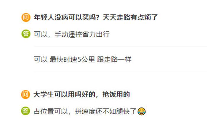 中新財(cái)經(jīng)注意到,在電商平臺(tái)上電動(dòng)輪椅的問(wèn)答區(qū),不少消費(fèi)者都對(duì)電動(dòng)輪椅展現(xiàn)出了濃厚的興趣,“年輕人沒(méi)病可以買嗎?天天走路有點(diǎn)煩了。”“大學(xué)生可以用嗎?”“食堂搶飯用!神器?!薄澳贻p人也可以用,省力出行。”