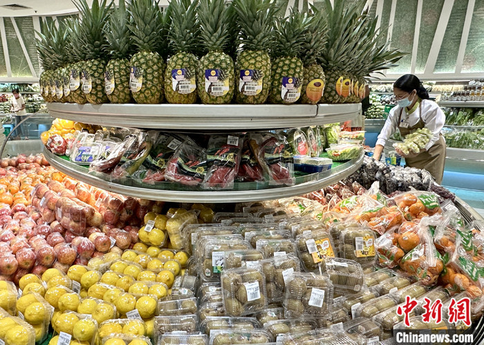 圖為菲律賓大馬尼拉地區(qū)馬卡蒂市,超市工作人員在整理水果。 中新社記者 張興龍 攝