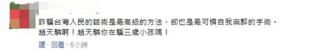 也有臺灣網友評論表示“果然是綠色邏輯思維,沒有最勇敢,只有最無知!”“趙天麟是在說相聲嗎?真愛鬼扯!”“詐騙臺灣人民的話術是最高級的方法,卻也是最可憐自我麻醉的手術!趙天麟?。≮w天麟你在騙三歲小孩嗎?”