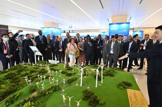 7月6日,駐華使節(jié)在國機(jī)集團(tuán)國際化經(jīng)營成果展廳內(nèi)參觀由該集團(tuán)承建的肯尼亞基佩托風(fēng)電項目沙盤。新華社記者 李鑫 攝