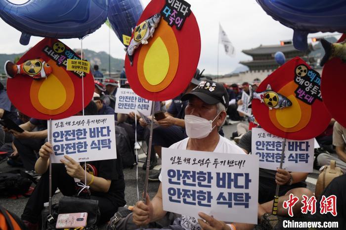 當(dāng)?shù)貢r(shí)間7月8日,韓國多個(gè)市民團(tuán)體和在野黨在首爾集會(huì),抗議日本強(qiáng)推核污染水排海計(jì)劃?!≈行律缬浾?劉旭 攝