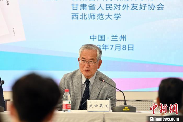 2023年7月8日,武田英文著作《通往森林的小路》中文版首發(fā)儀式在蘭州舉行。圖為武田英文與讀者分享他在甘肅的故事。 中新社記者 九美旦增 攝
