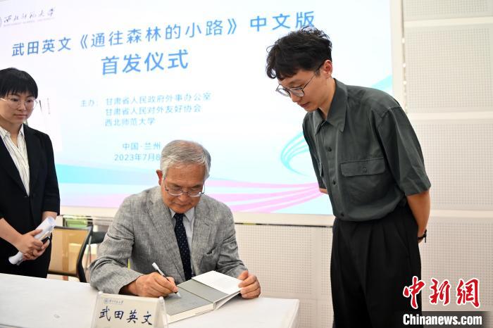2023年7月8日,武田英文著作《通往森林的小路》中文版首發(fā)儀式在蘭州舉行。圖為武田英文給現(xiàn)場(chǎng)嘉賓簽名。 中新社記者 九美旦增 攝