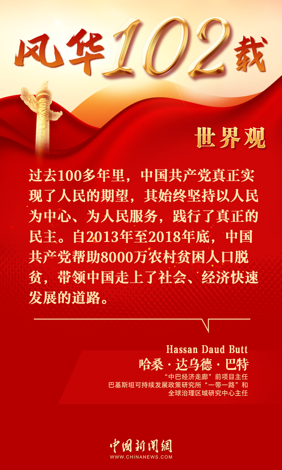 中新網(wǎng)7月8日電(陳彩霞)日前,投資領(lǐng)域?qū)<?,“中巴?jīng)濟走廊”前項目主任、巴基斯坦可持續(xù)發(fā)展政策研究所“一帶一路”和全球治理區(qū)域研究中心主任哈?!み_烏德·巴特(Hassan Daud Butt)在接受中新網(wǎng)專訪時表示,過去100多年里,中國共產(chǎn)黨真正實現(xiàn)了人民的期望,其始終堅持以人民為中心、為人民服務(wù),帶領(lǐng)中國走上了社會、經(jīng)濟快速發(fā)展的道路。