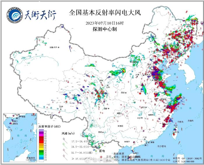 7月10日全國(guó)基本反射率閃電大風(fēng)。圖片來(lái)源:@中國(guó)天氣微博
