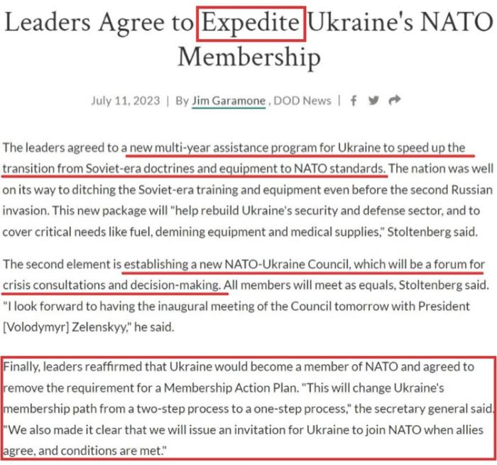 在一片爭吵聲中,北約立陶宛峰會發(fā)表的公報確定了一個包含“三要素”的“加快烏克蘭入約計劃”: