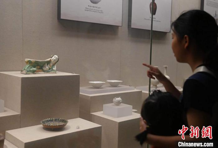 2023年7月13日,人們在安徽博物院參觀“宋三彩臥女抱鵝枕”(左上)。 中新社記者 韓蘇原 攝