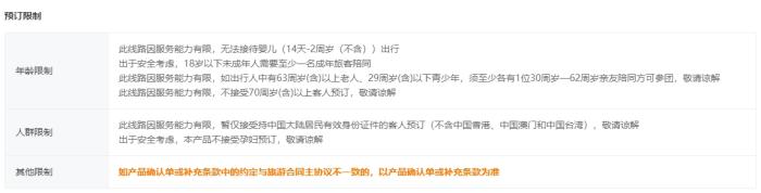 某云南跟團游產(chǎn)品預(yù)訂限制。 截圖自某在線旅游服務(wù)平臺。
