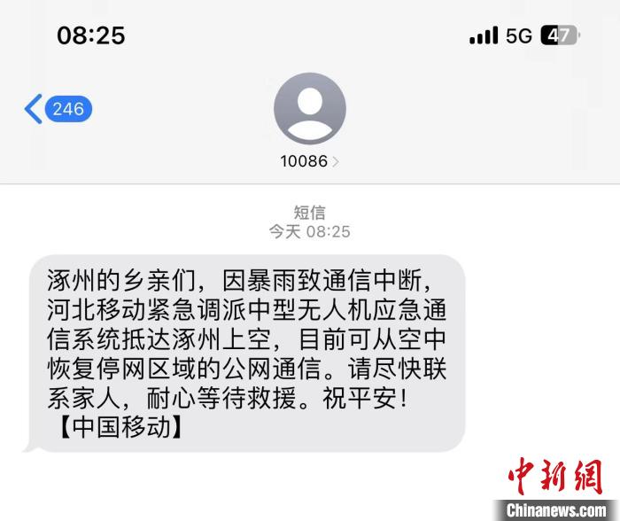 中新網(wǎng)石家莊8月3日電 (郝燁 趙景科)“【中國移動】涿州的鄉(xiāng)親們,因暴雨致通信中斷,河北移動緊急調(diào)派中型無人機應急通信系統(tǒng)抵達涿州上空,目前可從空中恢復停網(wǎng)區(qū)域的公網(wǎng)通信。請盡快聯(lián)系家人,耐心等待救援。祝平安!”8月3日早,河北涿州災區(qū)的群眾收到一條來自空中的短信。