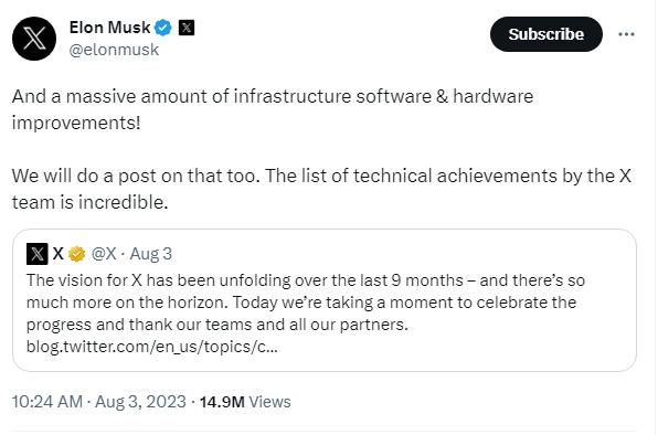 中新網(wǎng)8月4日電(魏晨曦) 當?shù)貢r間3日,推特(已更名為“X”)所有者馬斯克發(fā)文稱,“‘X’團隊取得的技術(shù)成就令人驚嘆。”此前,他放棄推特標志性的“小藍鳥”,將這一社交媒體的名字和標志更換為“X”,引發(fā)諸多不滿和風波。