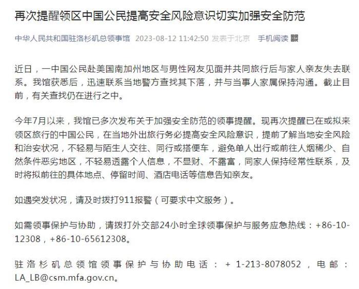 駐洛杉磯總領館領事保護與協(xié)助電話:+1-213-8078052,電郵:LA_LB@csm.mfa.gov.cn。