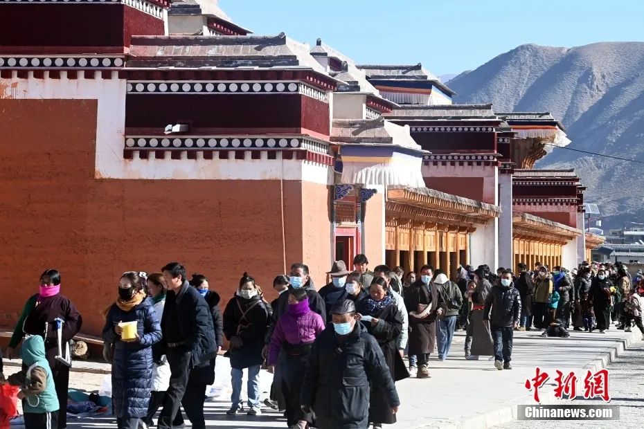 2023年2月5日被譽為“世界藏學(xué)府”的拉卜楞寺迎來一年中最熱鬧的“朝佛季”,眾多藏傳佛教信眾及游客前來轉(zhuǎn)經(jīng)、禮佛、朝拜。圖為信眾及游客前往朝佛途中。中新社記者 九美旦增 攝