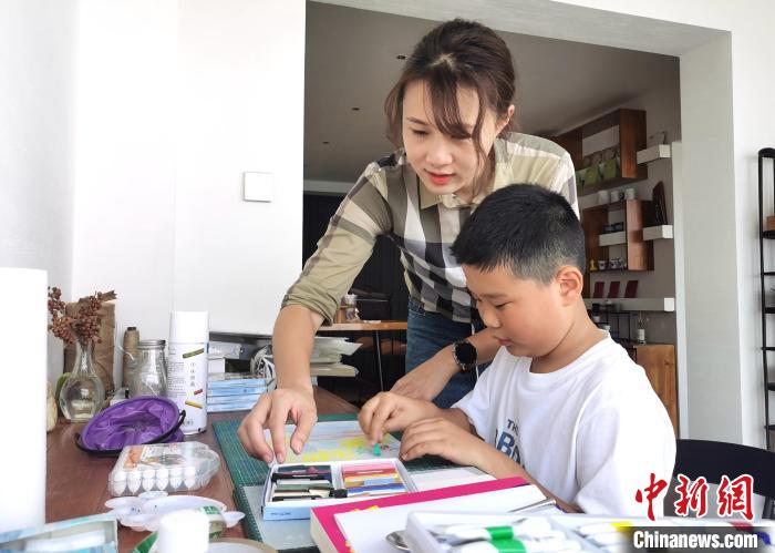 8月8日,吳婷婷在指導(dǎo)小朋友畫(huà)畫(huà)?! ≈行律缬浾?向一鵬 攝