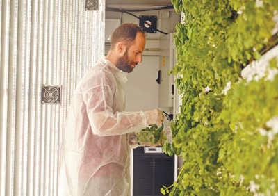 以色列一家農業(yè)科技公司在超市、餐館和購物中心的室內外安裝了多處便攜式城市垂直農場裝置。在這樣的“農場”中,蔬菜垂直排列在墻壁上的容器里,減少對水和土壤的使用,提高種植效率,供顧客選購。圖為一名工作人員在一家超市旁的垂直農場查看蔬菜生長情況。