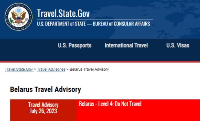 目前,美國務(wù)院對赴白俄羅斯的旅行建議為最高級別4級,即 “請勿前往”。